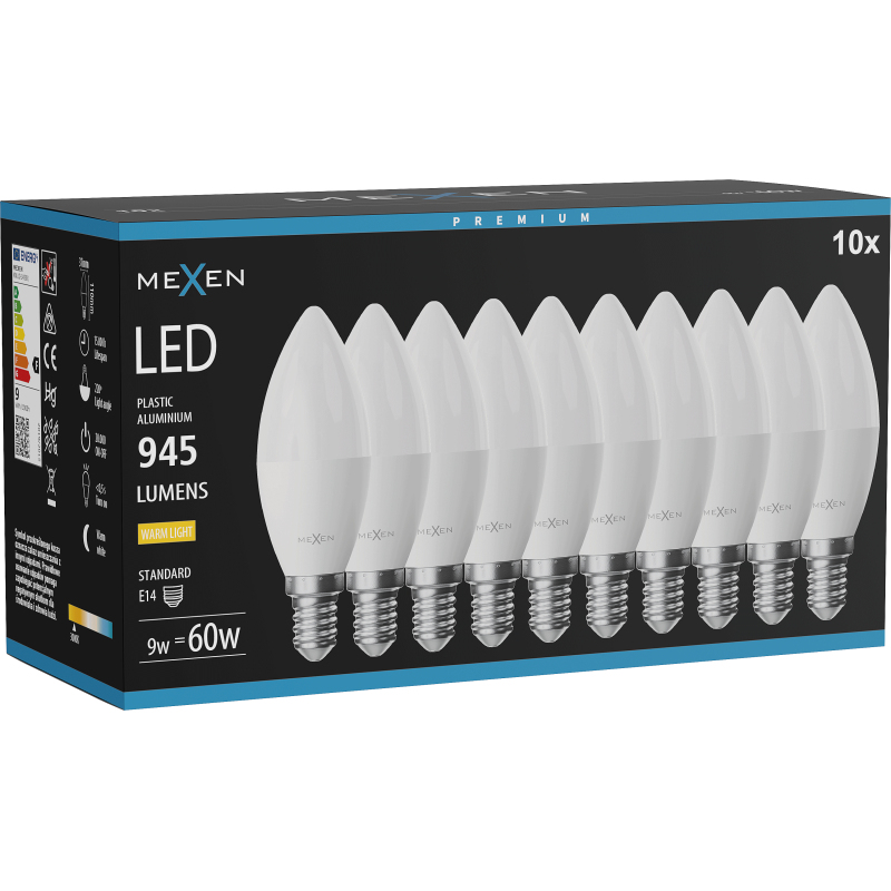 Mexen Nova 10x LED žárovka E14, C37, 9W, teplá - 3000K, 945 lm - L102-E14-0930-01x10