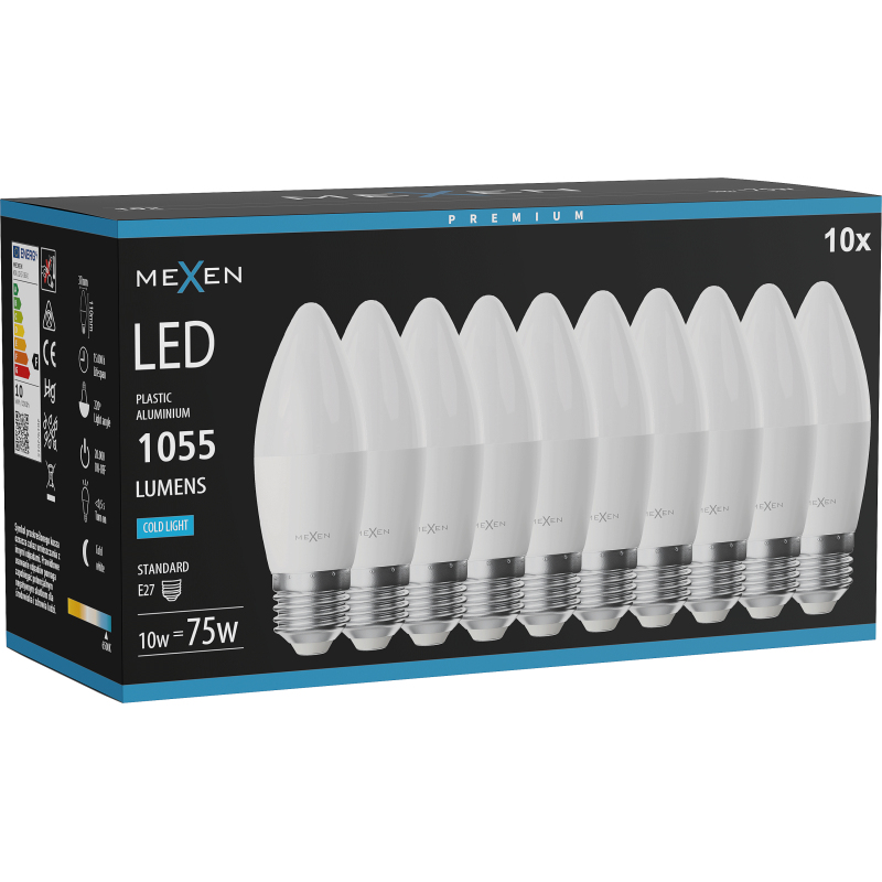 Mexen Nova 10x LED žárovka E27, C37, 10W, studená - 6500K, 1055 lm - L102-E27-1065-01x10