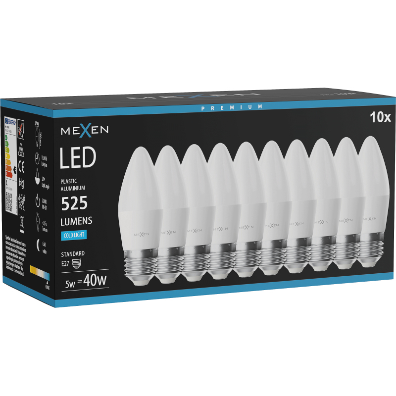 Mexen Nova 10x LED žárovka E27, C37, 5W, studená - 6500K, 525 lm - L102-E27-0565-01x10