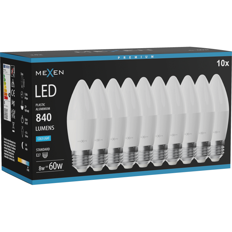 Mexen Nova 10x LED žárovka E27, C37, 8W, studená - 6500K, 840 lm - L102-E27-0865-01x10