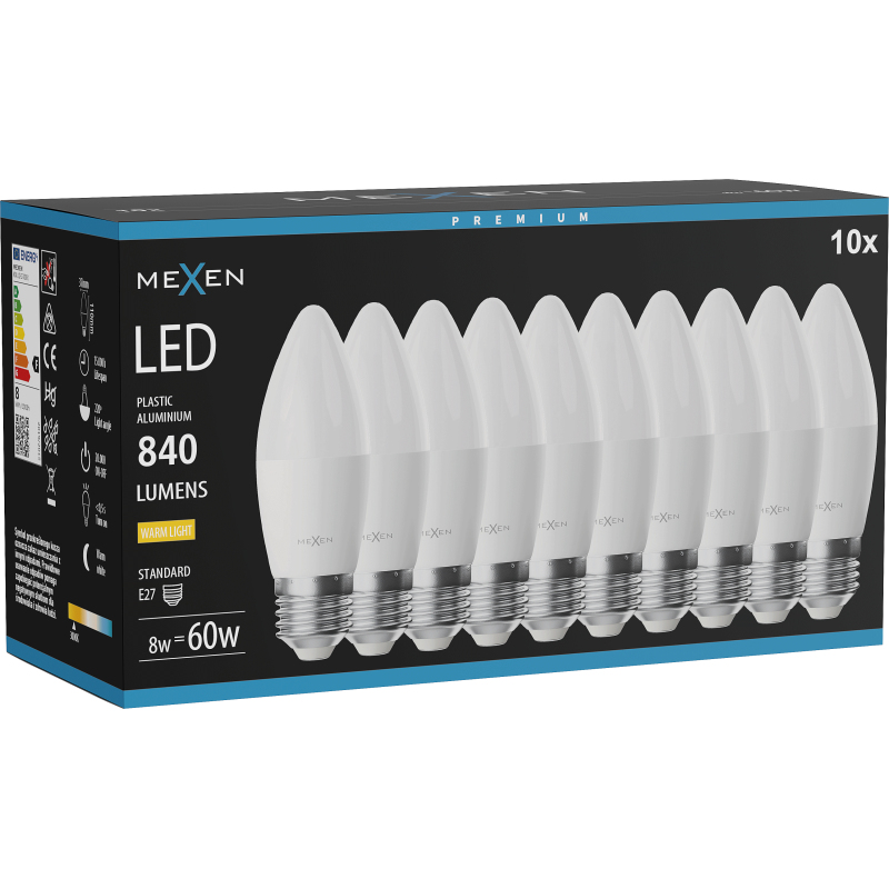 Mexen Nova 10x LED žárovka E27, C37, 8W, teplá - 3000K, 840 lm - L102-E27-0830-01x10