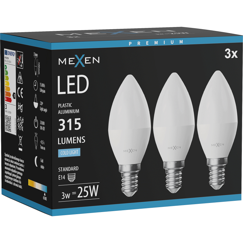 Mexen Nova 3x LED žárovka E14, C37, 3W, studená - 6500K, 315 lm - L102-E14-0365-01x03