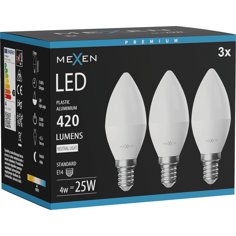 Mexen Nova 3x LED žárovka E14, C37, 4W, neutrální - 4000K, 420 lm - L102-E14-0440-01x03