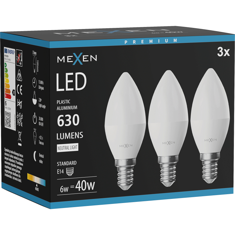Mexen Nova 3x LED žárovka E14, C37, 6W, neutrální - 4000K, 630 lm - L102-E14-0640-01x03