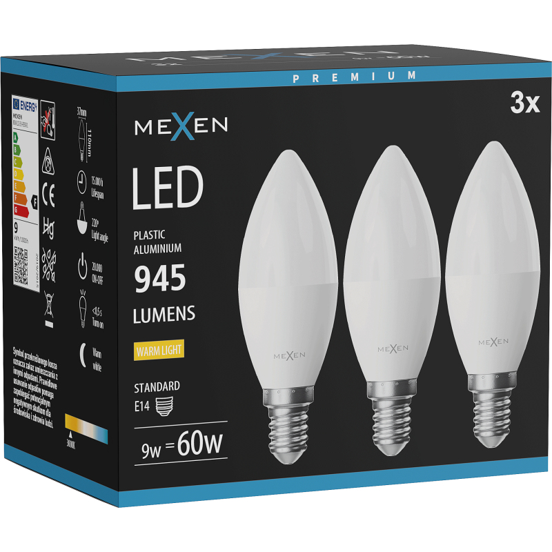 Mexen Nova 3x LED žárovka E14, C37, 9W, teplá - 3000K, 945 lm - L102-E14-0930-01x03