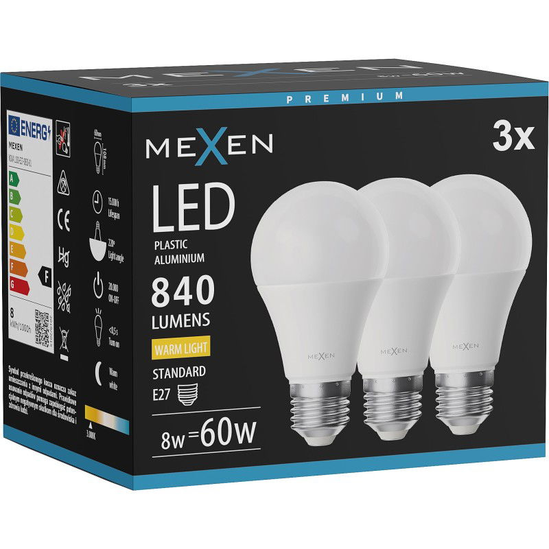 Mexen Nova 3x LED žárovka E27, A60, 8W, teplá - 3000K, 840 lm - L100-E27-0830-01x03
