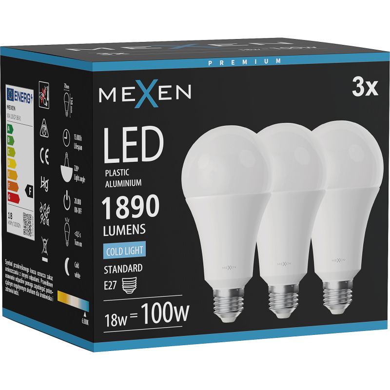 Mexen Nova 3x LED žárovka E27, A70, 18W, studená - 6500K, 1890 lm - L100-E27-1865-01x03