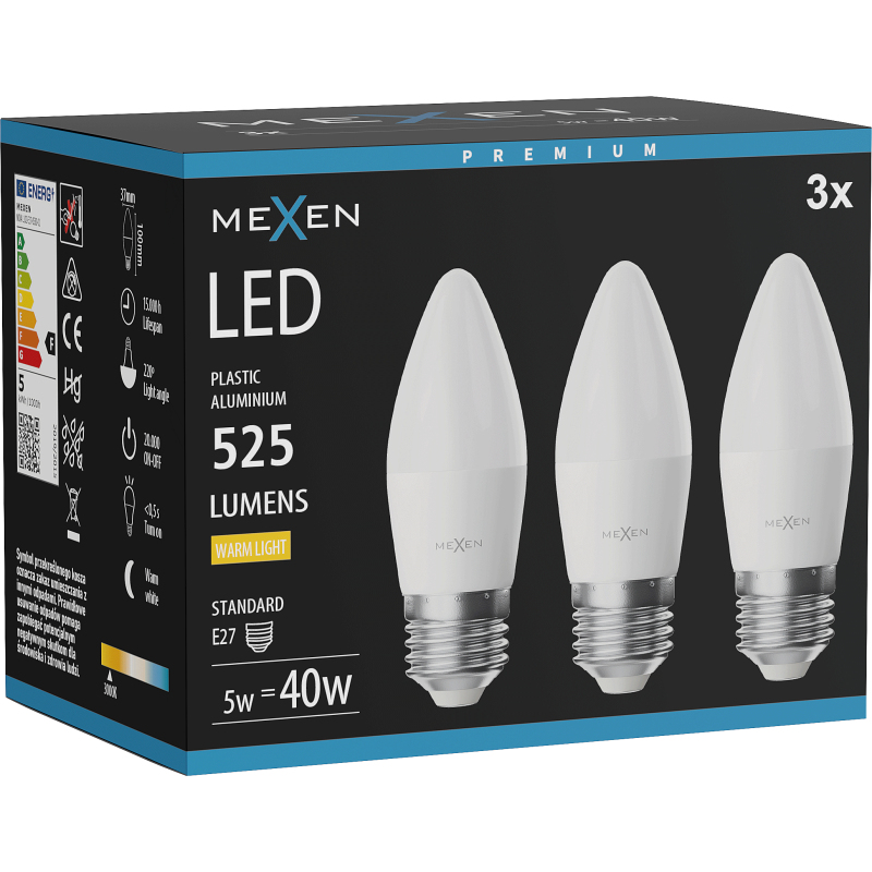 Mexen Nova 3x LED žárovka E27, C37, 5W, teplá - 3000K, 525 lm - L102-E27-0530-01x03