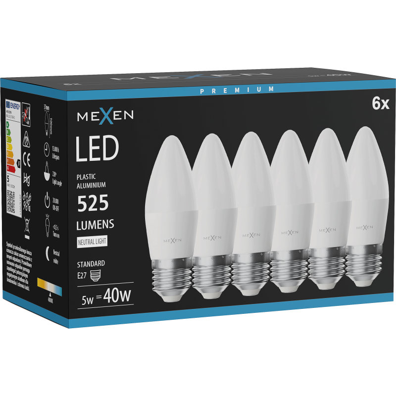 Mexen Nova 6x LED žárovka E27, C37, 5W, neutrální - 4000K, 525 lm - L102-E27-0540-01x06