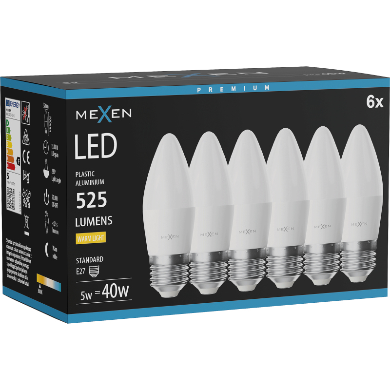 Mexen Nova 6x LED žárovka E27, C37, 5W, teplá - 3000K, 525 lm - L102-E27-0530-01x06
