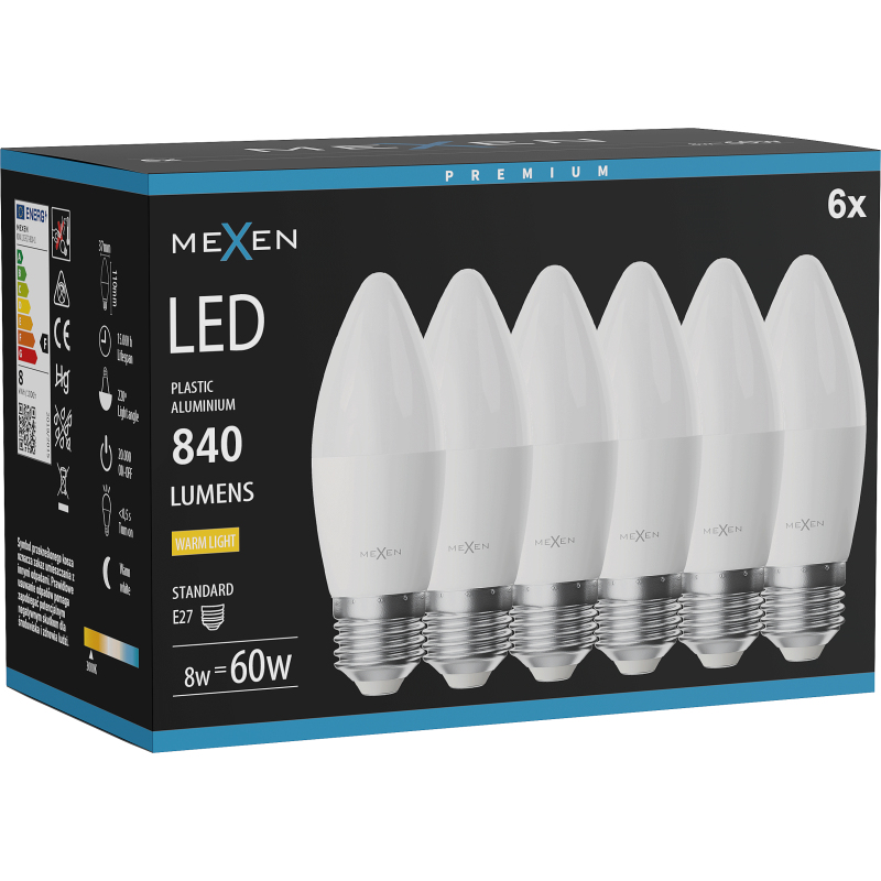 Mexen Nova 6x LED žárovka E27, C37, 8W, teplá - 3000K, 840 lm - L102-E27-0830-01x06