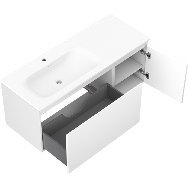 Specifikace produktu: Rozměry skříňky: Šířka: 120 cm Hloubka: 46 cm Výška: 47 cm Sada obsahuje: Zásuvková skříňka pod umyvadlo: Šířka: 80 cm Hloubka: 46 cm Výška: 47 cm Barva korpusu: Matná bílá Materiál korpusu: Lakovaná deska Barva čela: Matná bílá Materiál čela: Lakovaná MDF deska Struktura čela: Hladká Počet zásuvek: 1 Prostorná zásuvka s funkcí tlumeného dovírání Umyvadlová skříňka s dvířky: Šířka: 40 cm Výška: 47 cm Hloubka: 46 cm Barva korpusu: Matná bílá Materiál korpusu: Lakovaná deska Barva čela: Matná bílá Materiál čela: Lakovaná MDF deska Struktura čela: Hladká Počet dvířek: 1 1 police Panty s funkcí tlumeného dovírání Univerzální montáž dvířek (levé/pravé) Povrch odolný vůči UV záření Umyvadlo: Šířka: 121 cm Hloubka: 46,5 cm Výška: 16,5 cm Barva umyvadla: Matná bílá Materiál umyvadla: Konglomerát Otvor pro přepad: Ano Otvor pro baterii: Ano Produkt smontovaný