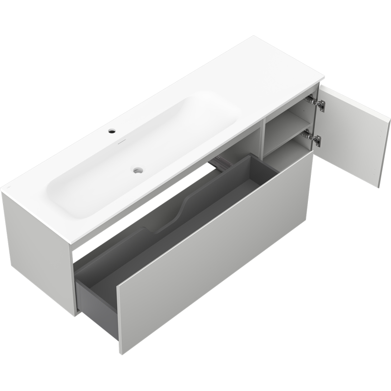 Specifikace produktu: Rozměry skříňky: Šířka: 160 cm Hloubka: 46 cm Výška: 47 cm Sada obsahuje: Zásuvková skříňka pod umyvadlo: Šířka: 120 cm Hloubka: 46 cm Výška: 47 cm Barva korpusu: Matně šedá Materiál korpusu: Lakovaná deska Barva čela: Matně šedá Materiál čela: Lakovaná MDF deska Konstrukce čela: Hladká Počet zásuvek: 1 Prostorná zásuvka s funkcí tlumeného dovírání Umyvadlová skříňka s dvířky: Šířka: 40 cm Výška: 47 cm Hloubka: 46 cm Barva korpusu: Matně šedá Materiál korpusu: Lakovaná deska Barva čela: Matně šedá Materiál čela: Lakovaná MDF deska Konstrukce čela: Hladká Počet dvířek: 1 1 police Panty s funkcí tlumeného dovírání Univerzální montáž dvířek (levé/pravé) Povrch odolný vůči UV záření Umyvadlo: Šířka: 161 cm Hloubka: 46,5 cm Výška: 16,5 cm Barva umyvadla: Matně bílá Materiál umyvadla: Konglomerát Otvor pro přepad: Ano Otvor pro baterii: Ano Produkt smontovaný