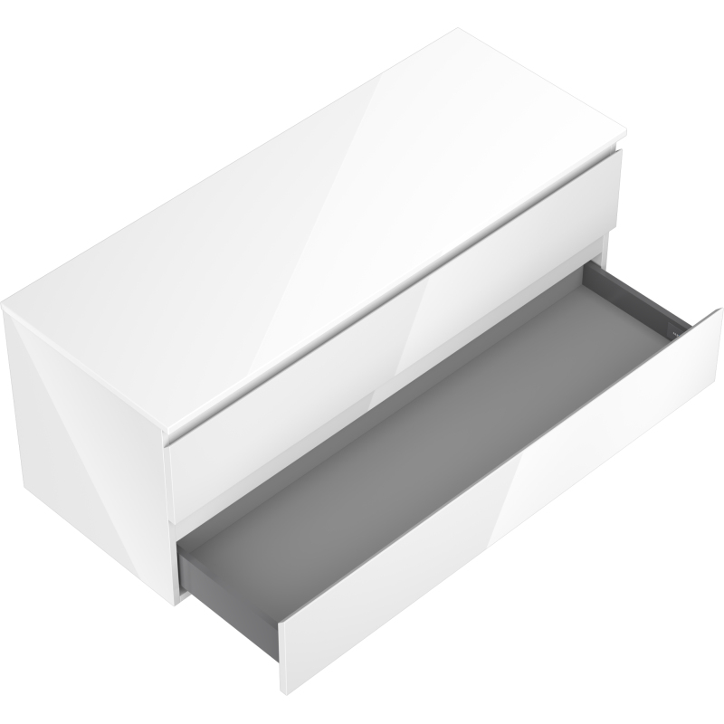 Specifikace produktu: Rozměry skříňky: Šířka: 120 cm Výška: 47 cm Hloubka: 46 cm Barva korpusu: Lesklá bílá Materiál korpusu: Lakovaná deska Barva čela: Lesklá bílá Materiál čela: Lakovaná MDF deska Struktura čela: Hladká Počet zásuvek: 2 Prostorná zásuvka s funkcí tlumeného dovírání Plný výsuv pro snadný přístup k obsahu zásuvky Povrch odolný vůči UV záření Rozměry pracovní desky: Šířka: 120,6 cm Hloubka: 46,5 cm Tloušťka: 1,8 cm Barva pracovní desky: Lesklá bílá Materiál pracovní desky: Lakovaná MDF deska Povrch odolný vůči UV záření Ideální jako podstavec pro umyvadla na desku Sestavený produkt