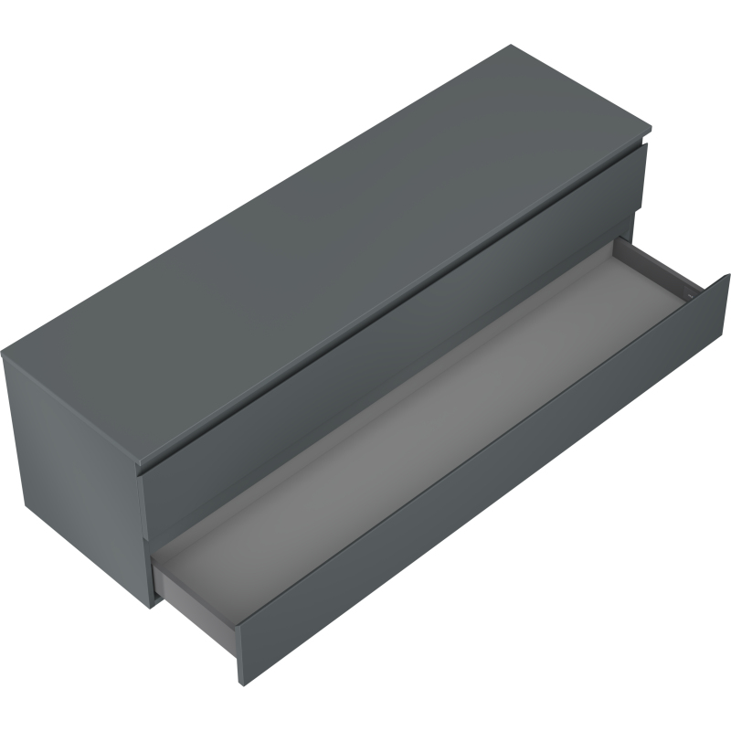 Specifikace produktu: Rozměry skříňky: Šířka: 160 cm Výška: 47 cm Hloubka: 46 cm Barva korpusu: Matný grafit Materiál korpusu: Lakovaná deska Barva čela: Matný grafit Materiál čela: Lakovaná MDF deska Struktura čela: Hladká Počet zásuvek: 2 Prostorná zásuvka s funkcí tlumeného dovírání Plný výsuv pro snadný přístup k obsahu zásuvky Povrch odolný vůči UV záření Rozměry pracovní desky: Šířka: 160,6 cm Hloubka: 46,5 cm Tloušťka: 1,8 cm Barva pracovní desky: Matný grafit Materiál pracovní desky: Lakovaná MDF deska Povrch odolný vůči UV záření Ideální jako podstavec pro umyvadla na desku Sestavený produkt