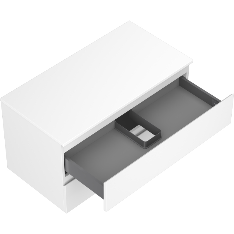 Specifikace produktu: Rozměry skříňky: Šířka: 90 cm Výška: 47 cm Hloubka: 46 cm Barva korpusu: Matná bílá Materiál korpusu: Lakovaná deska Barva čela: Matná bílá Materiál čela: Lakovaná MDF deska Struktura čela: Hladká Počet zásuvek: 2 Prostorná zásuvka s funkcí tlumeného dovírání Plný výsuv pro snadný přístup k obsahu zásuvky Povrch odolný vůči UV záření Rozměry pracovní desky: Šířka: 90,6 cm Hloubka: 46,5 cm Tloušťka: 1,8 cm Barva pracovní desky: Matná bílá Materiál pracovní desky: Lakovaná MDF deska Povrch odolný vůči UV záření Ideální jako podstavec pro umyvadla na desku Sestavený produkt