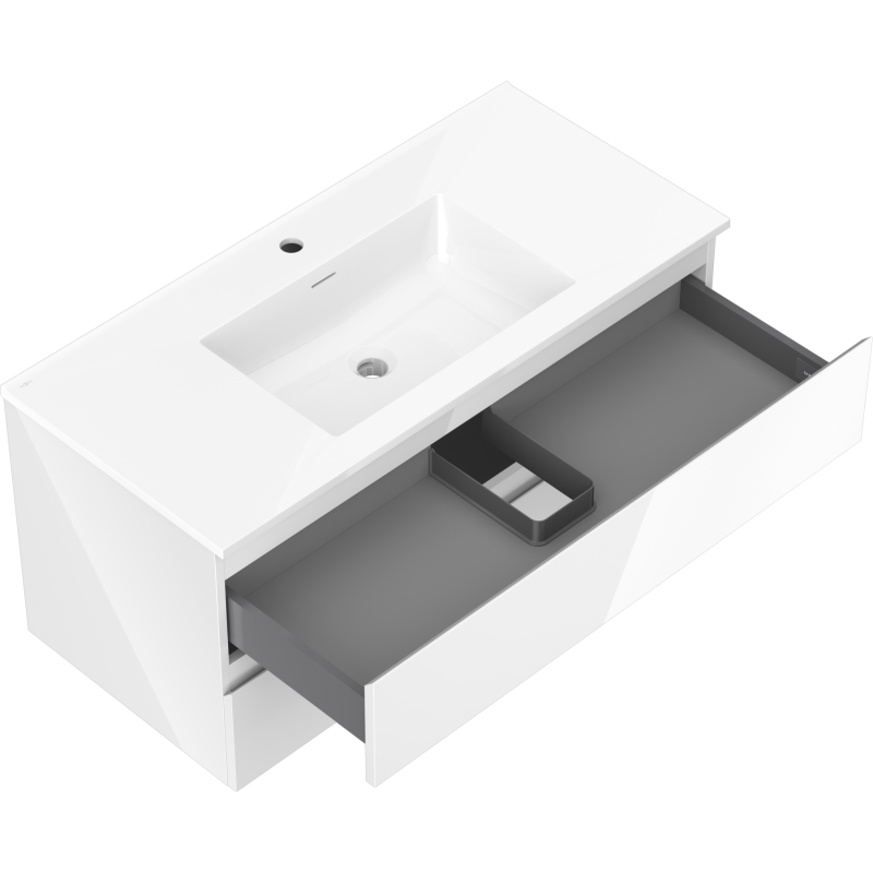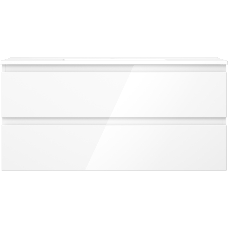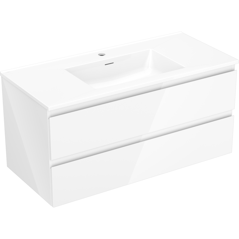 Specyfikacja produktu: Wymiary szafki: Szerokość: 100 cm Głębokość: 46 cm Wysokość: 47 cm Kolor korpus: Biały połysk Materiał korpus: Płyta lakierowana Kolor front: Biały połysk Materiał front: Płyta MDF lakierowana Struktura frontu: Gładka Ilość szuflad: 2 Przestronna szuflada z funkcją cichego domyku Powierzchnia odporna na promienie UV Wymiary umywalki: Szerokość: 101 cm Głębokość: 46,5 cm Wysokość: 16,5 cm Kolor umywalki: Biały połysk Materiał umywalki: Konglomerat Otwór przelewowy: Tak Otwór na baterie: Tak Produkt zmontowany