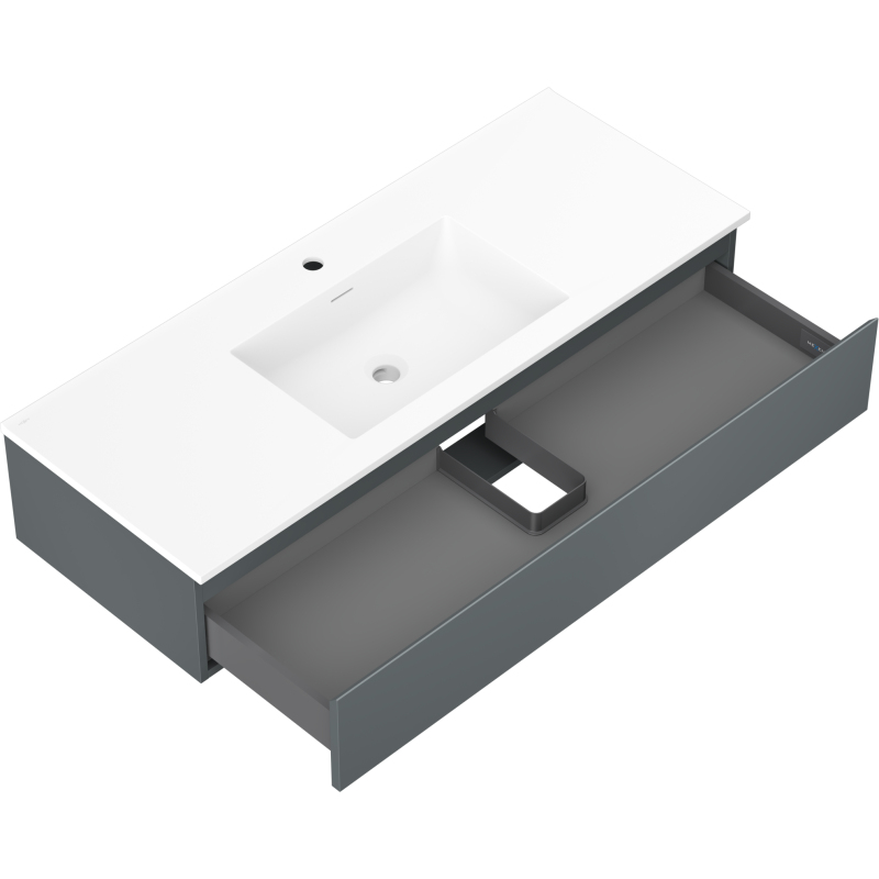 Specyfikacja produktu: Wymiary szafki: Szerokość: 120 cm Głębokość: 46 cm Wysokość: 23,5 cm Kolor korpus: Grafit mat Materiał korpus: Płyta lakierowana Kolor front: Grafit mat Materiał front: Płyta MDF lakierowana Struktura frontu: Gładka Ilość szuflad: 1 Przestronna szuflada z funkcją cichego domyku Powierzchnia odporna na promienie UV Wymiary umywalki: Szerokość: 121 cm Głębokość: 46,5 cm Wysokość: 16,5 cm Kolor umywalki: Biały mat Materiał umywalki: Konglomerat Otwór przelewowy: Tak Otwór na baterie: Tak Produkt zmontowany