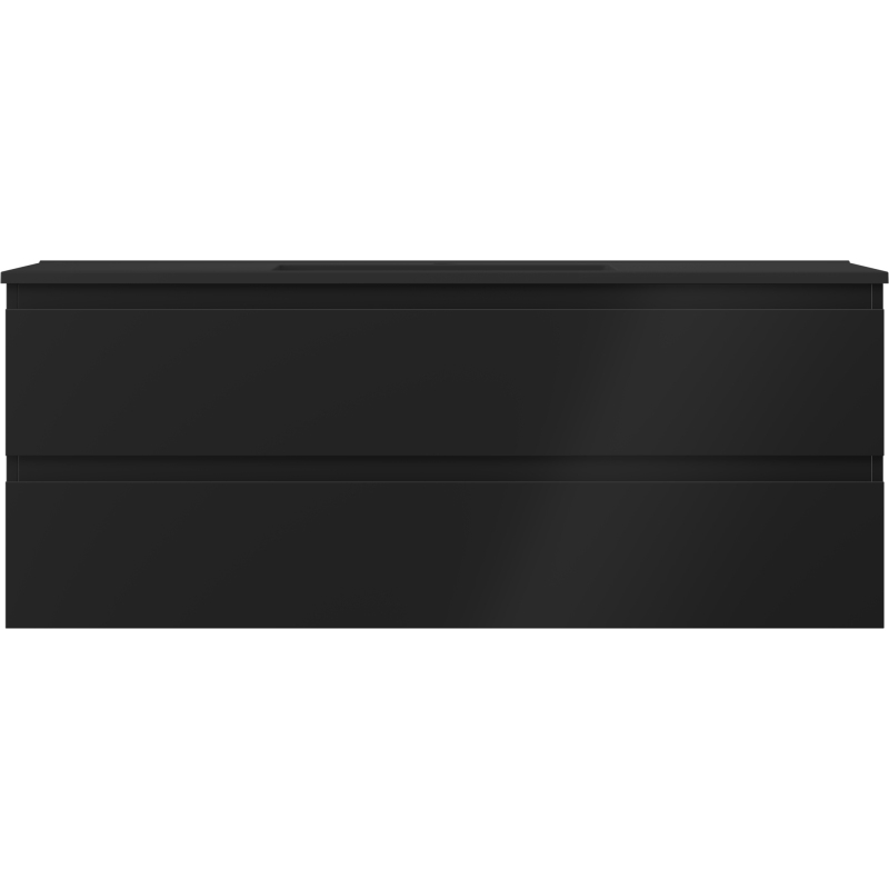 Specyfikacja produktu: Wymiary szafki: Szerokość: 120 cm Głębokość: 46 cm Wysokość: 47 cm Kolor korpus: Czarny mat Materiał korpus: Płyta lakierowana Kolor front: Czarny mat Materiał front: Płyta MDF lakierowana Struktura frontu: Gładka Ilość szuflad: 2 Przestronna szuflada z funkcją cichego domyku Powierzchnia odporna na promienie UV Wymiary umywalki: Szerokość: 121 cm Głębokość: 46,5 cm Wysokość: 16,5 cm Kolor umywalki: Czarny mat Materiał umywalki: Konglomerat Otwór przelewowy: Tak Otwór na baterie: Tak Produkt zmontowany