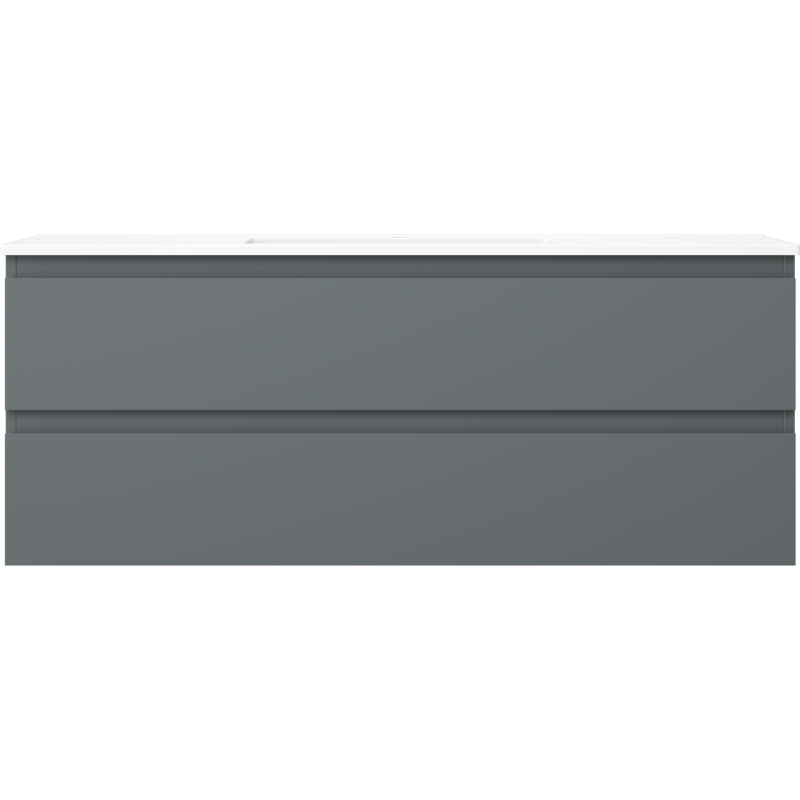 Specyfikacja produktu: Wymiary szafki: Szerokość: 120 cm Głębokość: 46 cm Wysokość: 47 cm Kolor korpus: Grafit mat Materiał korpus: Płyta lakierowana Kolor front: Grafit mat Materiał front: Płyta MDF lakierowana Struktura frontu: Gładka Ilość szuflad: 2 Przestronna szuflada z funkcją cichego domyku Powierzchnia odporna na promienie UV Wymiary umywalki: Szerokość: 121 cm Głębokość: 46,5 cm Wysokość: 16,5 cm Kolor umywalki: Biały mat Materiał umywalki: Konglomerat Otwór przelewowy: Tak Otwór na baterie: Tak Produkt zmontowany