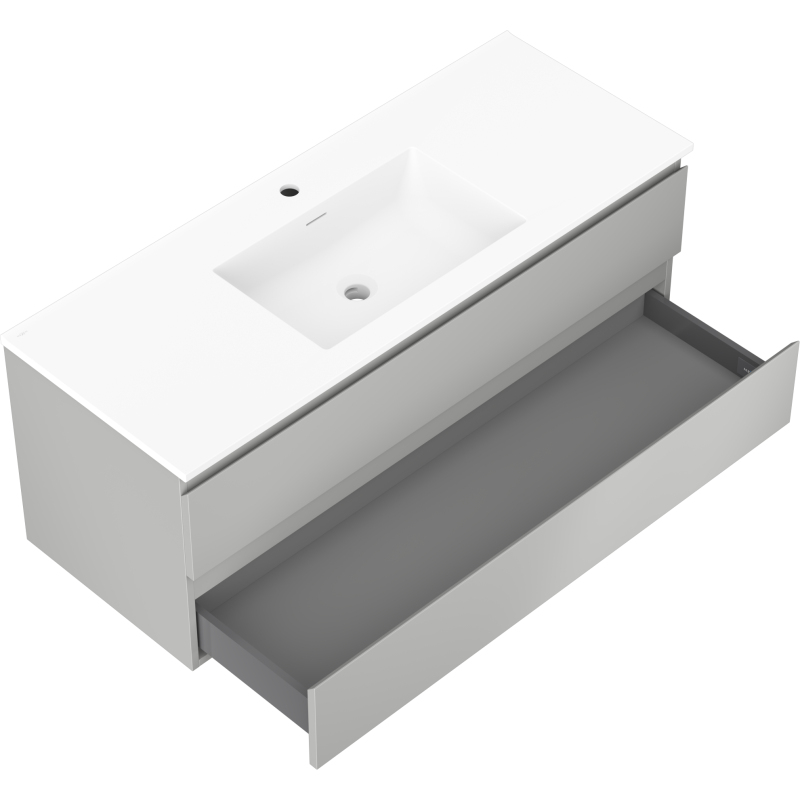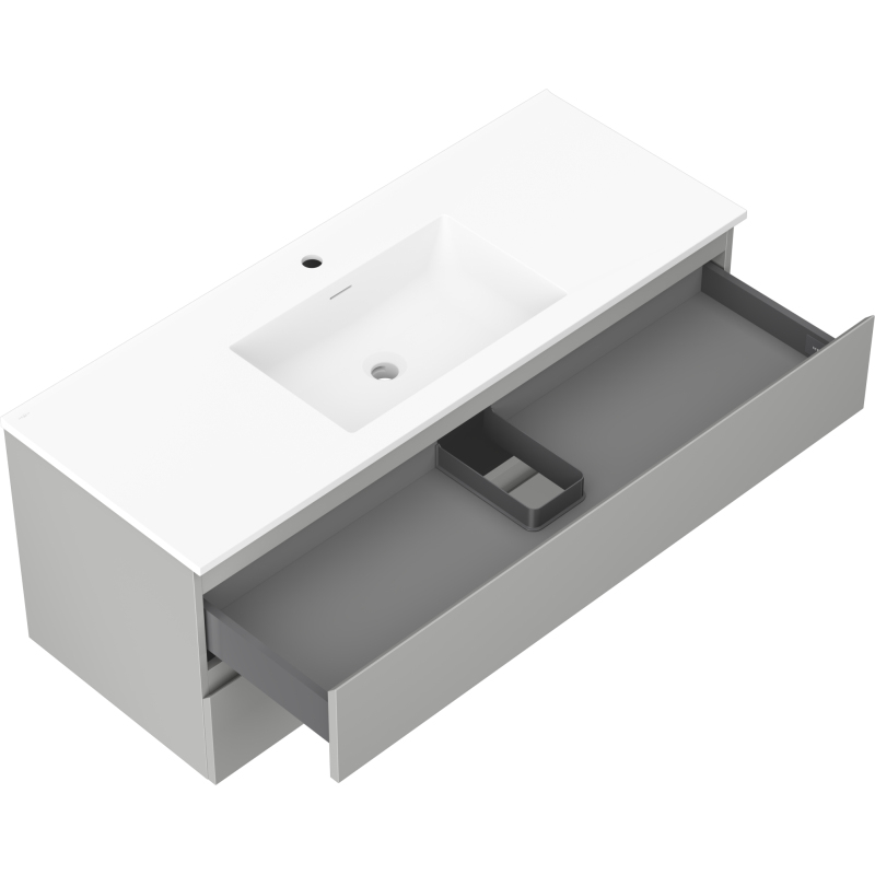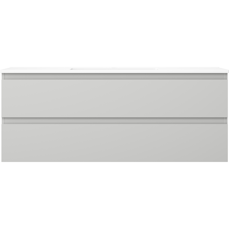 Specyfikacja produktu: Wymiary szafki: Szerokość: 120 cm Głębokość: 46 cm Wysokość: 47 cm Kolor korpus: Szary mat Materiał korpus: Płyta lakierowana Kolor front: Szary mat Materiał front: Płyta MDF lakierowana Struktura frontu: Gładka Ilość szuflad: 2 Przestronna szuflada z funkcją cichego domyku Powierzchnia odporna na promienie UV Wymiary umywalki: Szerokość: 121 cm Głębokość: 46,5 cm Wysokość: 16,5 cm Kolor umywalki: Biały mat Materiał umywalki: Konglomerat Otwór przelewowy: Tak Otwór na baterie: Tak Produkt zmontowany