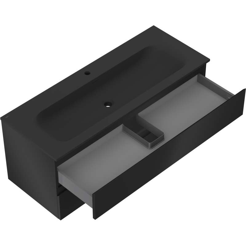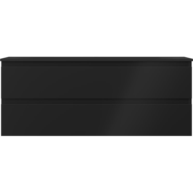 Specyfikacja produktu: Wymiary szafki: Szerokość: 120 cm Głębokość: 46 cm Wysokość: 47 cm Kolor korpus: Czarny mat Materiał korpus: Płyta lakierowana Kolor front: Czarny mat Materiał front: Płyta MDF lakierowana Struktura frontu: Gładka Ilość szuflad: 2 Przestronna szuflada z funkcją cichego domyku Powierzchnia odporna na promienie UV Wymiary umywalki: Szerokość: 121 cm Głębokość: 46,5 cm Wysokość: 16,5 cm Kolor umywalki: Czarny mat Materiał umywalki: Konglomerat Otwór przelewowy: Tak Otwór na baterie: Tak Produkt zmontowany