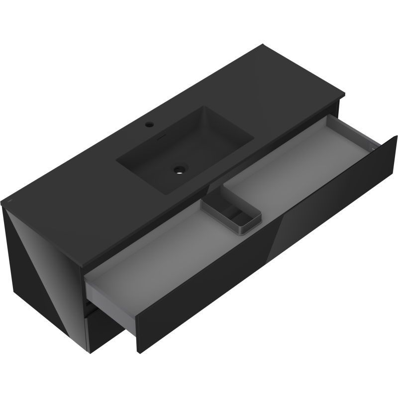 Specyfikacja produktu: Wymiary szafki: Szerokość: 140 cm Głębokość: 46 cm Wysokość: 47 cm Kolor korpus: Czarny połysk Materiał korpus: Płyta lakierowana Kolor front: Czarny połysk Materiał front: Płyta MDF lakierowana Struktura frontu: Gładka Ilość szuflad: 2 Przestronna szuflada z funkcją cichego domyku Powierzchnia odporna na promienie UV Wymiary umywalki: Szerokość: 141 cm Głębokość: 46,5 cm Wysokość: 16,5 cm Kolor umywalki: Czarny mat Materiał umywalki: Konglomerat Otwór przelewowy: Tak Otwór na baterie: Tak Produkt zmontowany