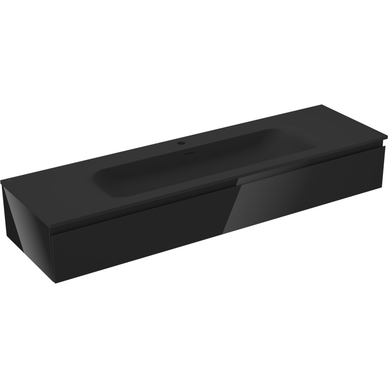 Specyfikacja produktu: Wymiary szafki: Szerokość: 160 cm Głębokość: 46 cm Wysokość: 23,5 cm Kolor korpus: Czarny połysk Materiał korpus: Płyta lakierowana Kolor front: Czarny połysk Materiał front: Płyta MDF lakierowana Struktura frontu: Gładka Ilość szuflad: 1 Przestronna szuflada z funkcją cichego domyku Powierzchnia odporna na promienie UV Wymiary umywalki: Szerokość: 161 cm Głębokość: 46,5 cm Wysokość: 16,5 cm Kolor umywalki: Czarny mat Materiał umywalki: Konglomerat Otwór przelewowy: Tak Otwór na baterie: Tak Produkt zmontowany