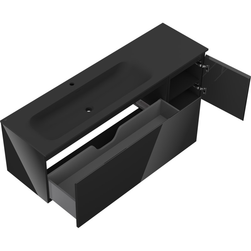 Specyfikacja produktu: Wymiary szafki: Szerokość: 160 cm Głębokość: 46 cm Wysokość: 47 cm Zestaw zawiera: Szafka podumywalkowa szufladowa: Szerokość: 120 cm Głębokość: 46 cm Wysokość: 47 cm Kolor korpus: Czarny połysk Materiał korpus: Płyta lakierowana Kolor front: Czarny połysk Materiał front: Płyta MDF lakierowana Struktura frontu: Gładka Ilość szuflad: 1 Przestronna szuflada z funkcją cichego domyku Powierzchnia odporna na promienie UV Szafka podumywalkowa z drzwiami: Szerokość: 40 cm Wysokość: 47 cm Głębokość: 46 cm Kolor korpus: Czarny połysk Materiał korpus: Płyta lakierowana Kolor front: Czarny połysk Materiał front: Płyta MDF lakierowana Struktura frontu: Gładka Ilość drzwi: 1 1 półka Zawiasy z funkcją cichego domyku Uniwersalny montaż drzwi (lewo/prawo) Powierzchnia odporna na promienie UV Umywalka: Szerokość: 161 cm Głębokość: 46,5 cm Wysokość: 16,5 cm Kolor umywalki: Czarny mat Materiał umywalki: Konglomerat Otwór przelewowy: Tak Otwór na baterie: Tak Produkt zmontowany