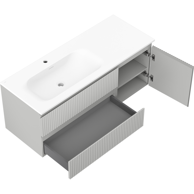 Mexen Rivel koupelnová skříňka 120 cm s umyvadlem Vela levým, 2S, 1D, drážkovaná, matná šedá/matná bílá - 91A23-12047-3-BBFFF62-W23L01
