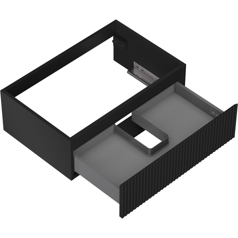 Specifikace produktu: Šířka: 70 cm Výška: 23,5 cm Hloubka: 46 cm Barva korpusu: Matná černá Materiál korpusu: Lakovaná deska Barva čela: Matná černá Materiál čela: Lakovaná MDF deska Struktura čela: Drážkovaná Počet zásuvek: 1 Prostorná zásuvka s funkcí tlumeného dovírání Plný výsuv pro snadný přístup k obsahu zásuvky Povrch odolný vůči UV záření Kombinovatelný s pracovní deskou nebo umyvadlem Otis, Vela Smontovaný produkt