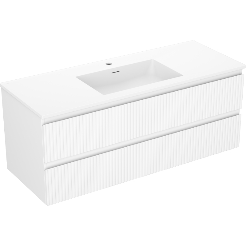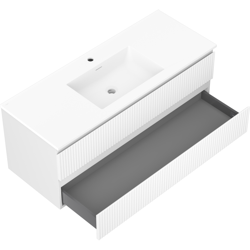 Specyfikacja produktu: Wymiary szafki: Szerokość: 120 cm Głębokość: 46 cm Wysokość: 47 cm Kolor korpus: Biały mat Materiał korpus: Płyta lakierowana Kolor front: Biały mat Materiał front: Płyta MDF lakierowana Struktura frontu: Ryflowana Ilość szuflad: 2 Przestronna szuflada z funkcją cichego domyku Powierzchnia odporna na promienie UV Wymiary umywalki: Szerokość: 121 cm Głębokość: 46,5 cm Wysokość: 16,5 cm Kolor umywalki: Biały mat Materiał umywalki: Konglomerat Otwór przelewowy: Tak Otwór na baterie: Tak Produkt zmontowany