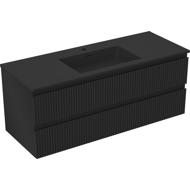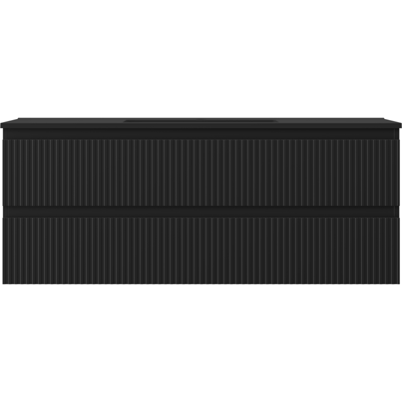 Specyfikacja produktu: Wymiary szafki: Szerokość: 120 cm Głębokość: 46 cm Wysokość: 47 cm Kolor korpus: Czarny mat Materiał korpus: Płyta lakierowana Kolor front: Czarny mat Materiał front: Płyta MDF lakierowana Struktura frontu: Ryflowana Ilość szuflad: 2 Przestronna szuflada z funkcją cichego domyku Powierzchnia odporna na promienie UV Wymiary umywalki: Szerokość: 121 cm Głębokość: 46,5 cm Wysokość: 16,5 cm Kolor umywalki: Czarny mat Materiał umywalki: Konglomerat Otwór przelewowy: Tak Otwór na baterie: Tak Produkt zmontowany
