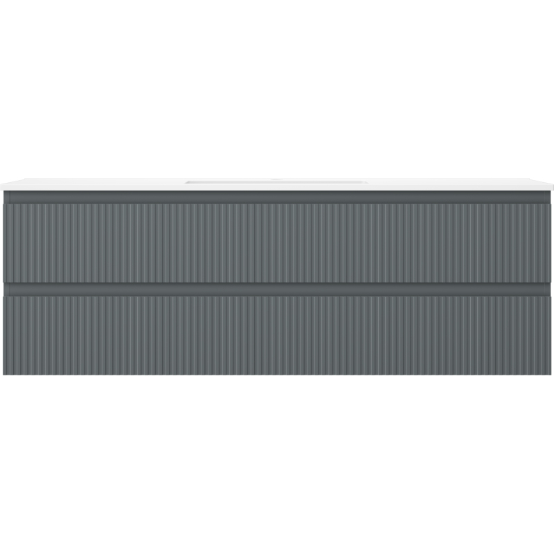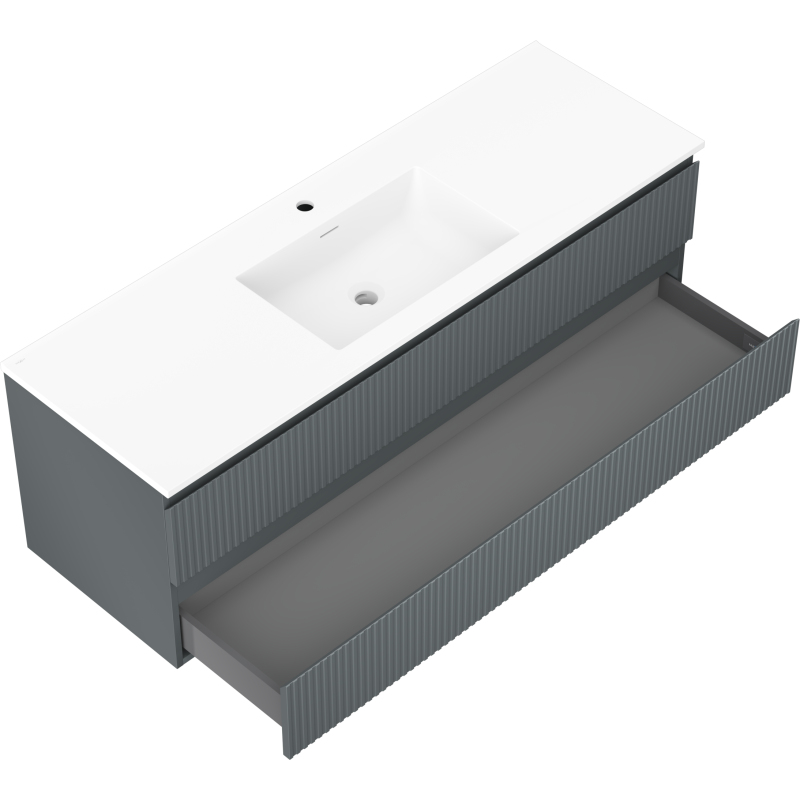 Specyfikacja produktu: Wymiary szafki: Szerokość: 140 cm Głębokość: 46 cm Wysokość: 47 cm Kolor korpus: Grafit mat Materiał korpus: Płyta lakierowana Kolor front: Grafit mat Materiał front: Płyta MDF lakierowana Struktura frontu: Ryflowana Ilość szuflad: 2 Przestronna szuflada z funkcją cichego domyku Powierzchnia odporna na promienie UV Wymiary umywalki: Szerokość: 141 cm Głębokość: 46,5 cm Wysokość: 16,5 cm Kolor umywalki: Biały mat Materiał umywalki: Konglomerat Otwór przelewowy: Tak Otwór na baterie: Tak Produkt zmontowany