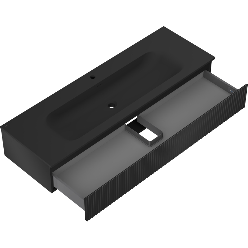 Specyfikacja produktu: Wymiary szafki: Szerokość: 140 cm Głębokość: 46 cm Wysokość: 23,5 cm Kolor korpus: Czarny mat Materiał korpus: Płyta lakierowana Kolor front: Czarny mat Materiał front: Płyta MDF lakierowana Struktura frontu: Ryflowana Ilość szuflad: 1 Przestronna szuflada z funkcją cichego domyku Powierzchnia odporna na promienie UV Wymiary umywalki: Szerokość: 141 cm Głębokość: 46,5 cm Wysokość: 16,5 cm Kolor umywalki: Czarny mat Materiał umywalki: Konglomerat Otwór przelewowy: Tak Otwór na baterie: Tak Produkt zmontowany