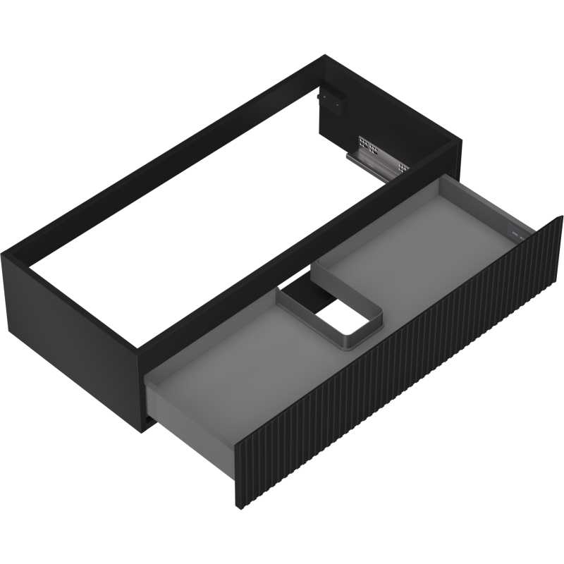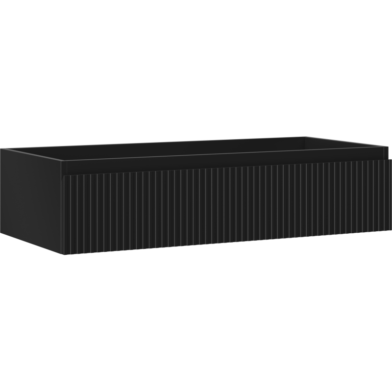 Specyfikacja produktu: Szerokość: 100 cm Wysokość: 23,5 cm Głębokość: 46 cm Kolor korpus: Czarny mat Materiał korpus: Płyta lakierowana Kolor front: Czarny mat Materiał front: Płyta MDF lakierowana Struktura frontu: Ryflowana Ilość szuflad: 1 Przestronna szuflada z funkcją cichego domyku Pełny wysuw ułatwiający dostęp do zawartości szuflad Powierzchnia odporna na promienie UV Do kompletowania z blatem lub umywalką Otis, Vela Produkt zmontowany
