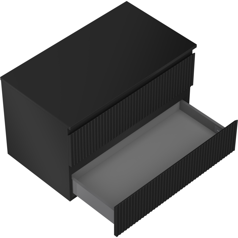 Specyfikacja produktu: Wymiary szafki: Szerokość: 80 cm Wysokość: 47 cm Głębokość: 46 cm Kolor korpus: Czarny mat Materiał korpus: Płyta lakierowana Kolor front: Czarny mat Materiał front: Płyta MDF lakierowana Struktura frontu: Ryflowana Ilość szuflad: 2 Przestronna szuflada z funkcją cichego domyku Pełny wysuw ułatwiający dostęp do zawartości szuflad Powierzchnia odporna na promienie UV Wymiary blatu: Szerokość: 80,6 cm Głębokość: 46,5 cm Grubość: 1,8 cm Kolor blatu: Czarny mat Materiał blatu: Płyta MDF lakierowana Powierzchnia odporna na promienie UV Idealny jako podstawa do umywalek nablatowych Produkt zmontowany
