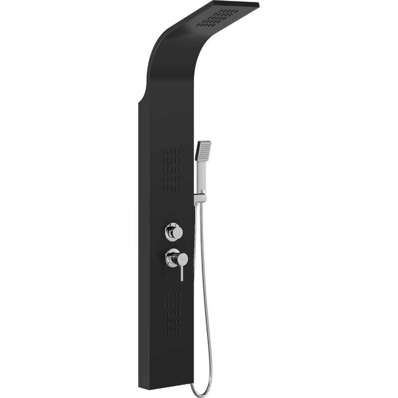 Specyfikacja produktu: Materiał: Stal nierdzewna Kolor: Czarny Wysokość: 150 cm Szerokość: 22 cm Ilość funkcji: 3 Praktyczna półka na kosmetyki Zintegrowana deszczownica Słuchawka prysznicowa Wąż z osłoną ze stali nierdzewnej 150 cm Dysze silikonowe Anti-Calc ułatwiają usuwanie kamienia