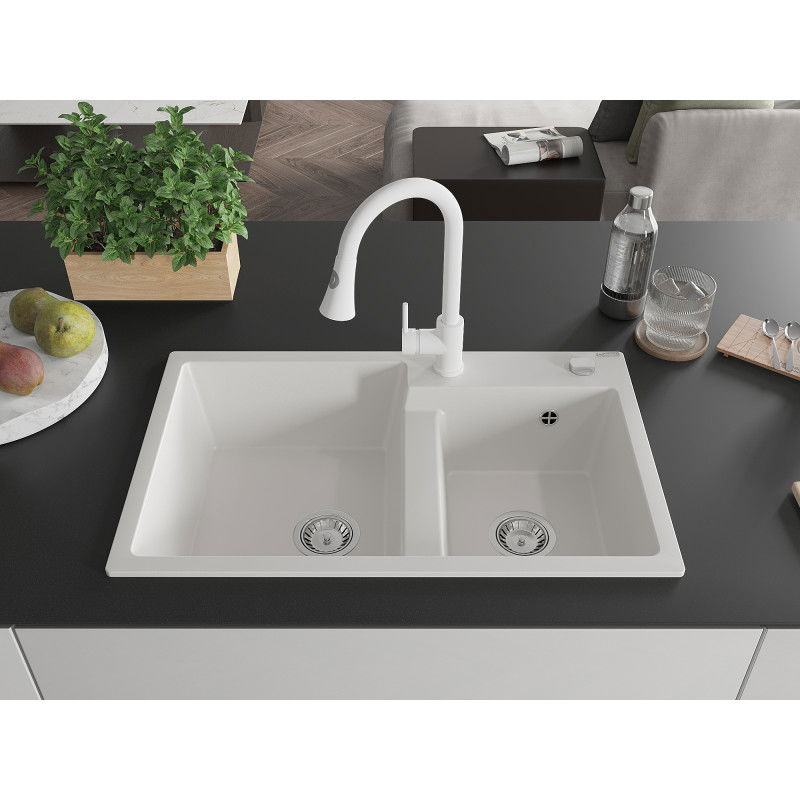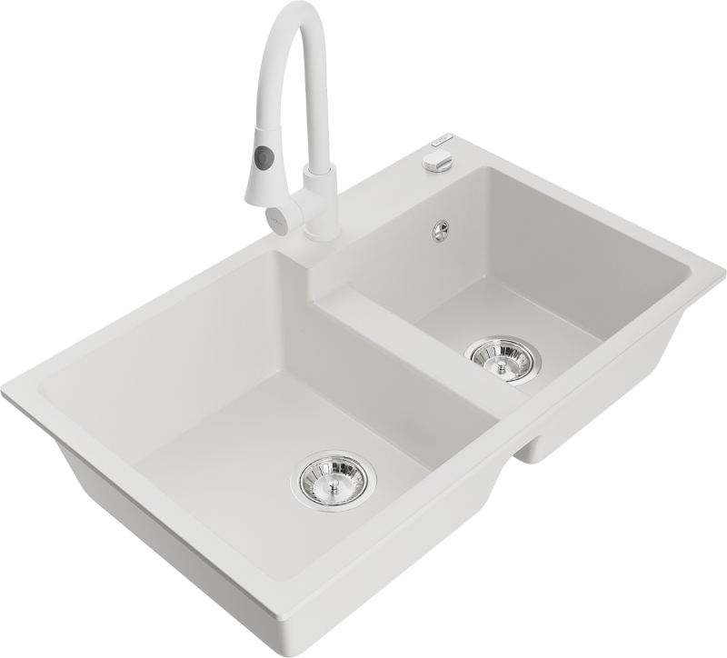 Mexen Tomas 2miskový granitový dřez s kuchyňskou baterií Elia, bílá - 6516-20-670101-20