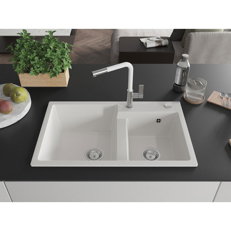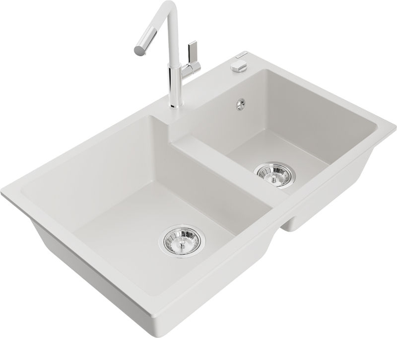 Mexen Tomas 2miskový granitový dřez s kuchyňskou baterií Flora, bílá - 6516-20-670401-02