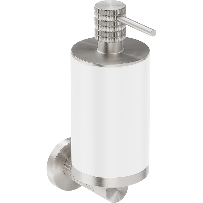 Specyfikacja produktu: Materiał: Metal + Konglomerat Wykończenie: Biały/Nikiel szczotkowany Szerokość: 7 cm Wysokość: 20 cm Odległość od ściany: 10 cm Pojemność: 250 ml