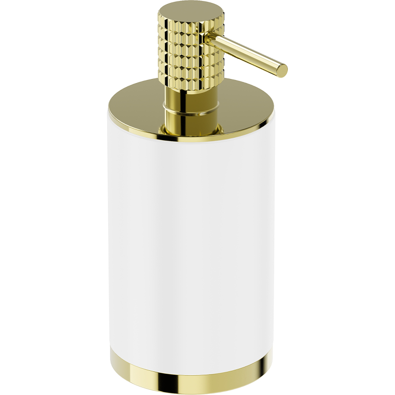 Specyfikacja produktu: Materiał: Stal nierdzewna + Konglomerat Wykończenie: Biały/Złoty Szerokość: 7 cm Wysokość: 16 cm Pojemność: 250 ml