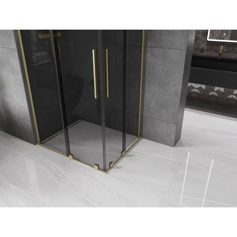 Specifikace produktu: Rozměr: 100x90 cm Výška: 200 cm Montáž: Univerzální Vstup: Posuvné dveře Barva skla: Grafit Povrchová úprava: Kartáčované zlato Typ skla: Tvrzené Tloušťka skla: 8 mm Profil: Hliník Stabilizátor úhlu L: Nerezová ocel Povlak pro snadné čištění Vyrovnání nerovností stěny Nastavení šířky Možnost montáže na sprchovou vaničku nebo obklady Jednoduché válečky nejvyšší kvality Nerezová klika Sada těsnění pro odvod vody Hliníkový práh pro těsnění dveří