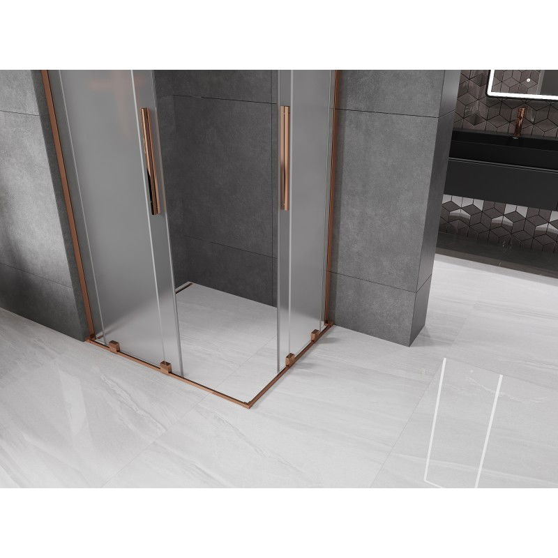 Specifikace produktu: Rozměr: 100x90 cm Výška: 200 cm Montáž: Univerzální Vstup: Posuvné dveře Barva skla: Mléčná Povrchová úprava: Růžové zlato Typ skla: Tvrzené Tloušťka skla: 8 mm Profil: Hliník Stabilizátor úhlu L: Nerezová ocel Povrchová úprava pro snadné čištění Vyrovnání nerovností stěny Nastavení šířky Možnost montáže na sprchovou vaničku nebo obklady Jednoduché válečky nejvyšší kvality Nerezová rukojeť Sada těsnění pro odvod vody Hliníkový práh těsnění dveří