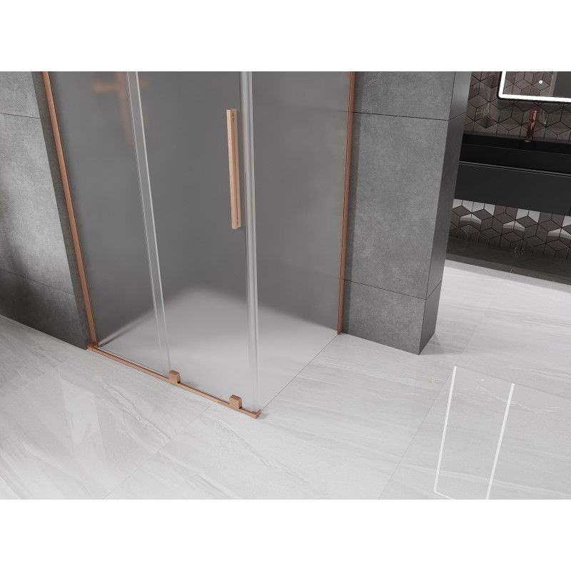 Specifikace produktu: Rozměr: 110x120 cm (dveře 110 cm, stěna 120 cm) Výška: 200 cm Montáž: Univerzální Vstup: Posuvné dveře Barva skla: Mléčná povrchová úprava: Kartáčovaná měď Typ skla: Tvrzené Tloušťka skla: 8 mm Profil: Hliník Stabilizátor úhlu L: Nerezová ocel Povlak pro snadné čištění Vyrovnání nerovností stěny Nastavení šířky Možnost montáže na sprchovou vaničku nebo obklady Jednoduché válečky nejvyšší kvality Nerezová rukojeť Sada těsnění pro odvod vody Hliníkový práh těsnění dveří