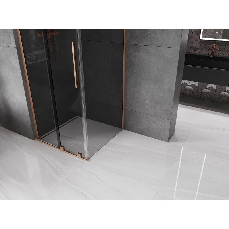 Specifikace produktu: Rozměr: 120x120 cm (dveře 120 cm, stěna 120 cm) Výška: 200 cm Montáž: Univerzální Vstup: Posuvné dveře Barva skla: Grafit Povrchová úprava: Kartáčovaná měď Typ skla: Tvrzené Tloušťka skla: 8 mm Profil: Hliník Stabilizátor úhlu L: Nerezová ocel Povlak pro snadné čištění Vyrovnání nerovností stěny Nastavení šířky Možnost montáže na sprchovou vaničku nebo obklady Jednoduché válečky nejvyšší kvality Nerezová rukojeť Sada těsnění pro odvod vody Hliníkový práh těsnění dveří
