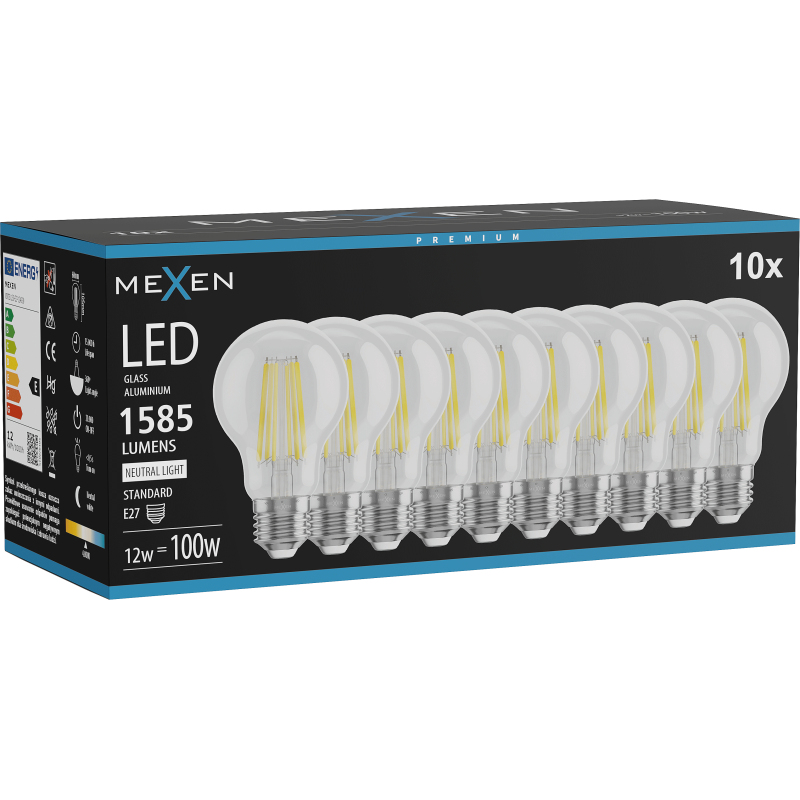 Mexen Vintis 10x żarówka filament LED E27, A60, 12W, Neutralna - 4000K, 1585 lm, clear - L150-E27-1240-00x10