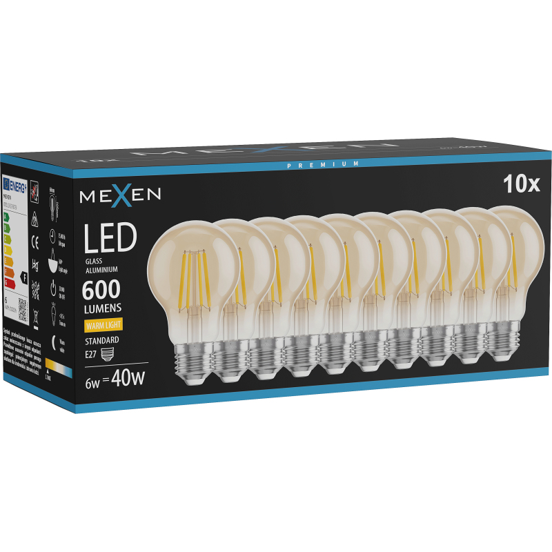 Mexen Vintis 10x żarówka filament LED E27, A60, 6W, Ciepła - 2700K, 600 lm, amber - L150-E27-0627-50x10