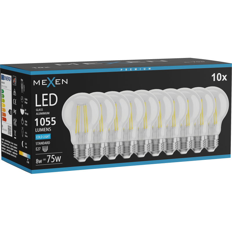 Mexen Vintis 10x żarówka filament LED E27, A60, 8W, Zimna - 6500K, 1055 lm, clear - L150-E27-0865-00x10