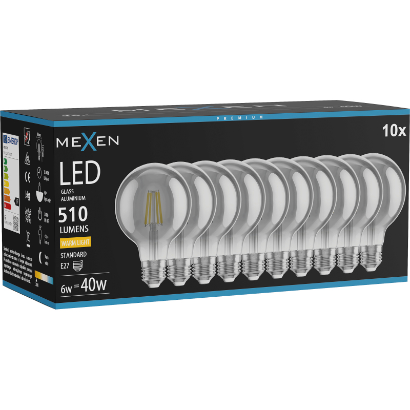 Mexen Vintis 10x żarówka filament LED E27, G80, 6W, Ciepła - 2700K, 510 lm, smoke - L155-E27-0627-70x10